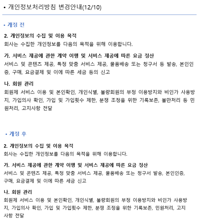 보다 나은 서비스 제공을 위해서 개인정보처리 방침을 개정하오니, 아래 내용을 참고하셔서 서비스 이용에 불편이 없도록 유의하시기 바랍니다.
